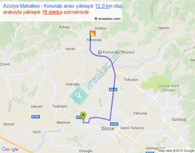 Aziziye Mahallesi - Konuralp arası yaklaşık olarak 90 km/h ile yukarıda belirtilen sürede olup, iki yerin kuş uçuşu uzaklığı (mesafesi) 8'dir. Yolculuk otobüsle 23 dakika sürmektedir.