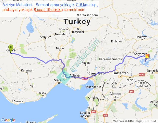 Aziziye Mahallesi - Samsat arası yaklaşık olarak 90 km/h ile yukarıda belirtilen sürede olup, iki yerin kuş uçuşu uzaklığı (mesafesi) 524'dir. Eğer belirtilen yerler arasında uçak seferi var ise bu süre uçakla 48 dakika'ya kadar düşebilir. Yolculuk otobüsle 10 saat 48 dakika sürmektedir.