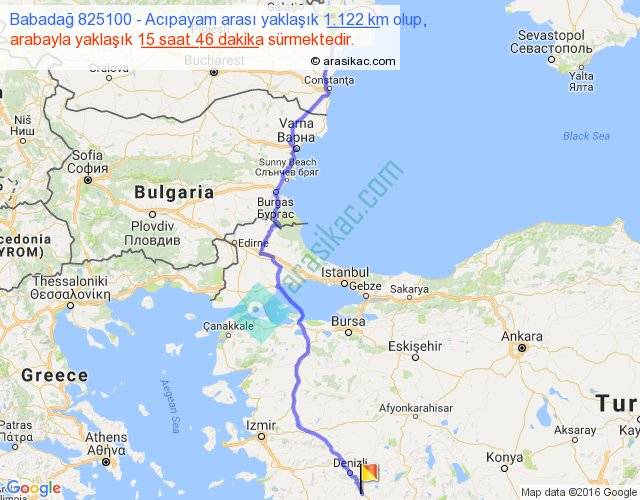 Babadağ 825100 - Acıpayam arası yaklaşık olarak 90 km/h ile yukarıda belirtilen sürede olup, iki yerin kuş uçuşu uzaklığı (mesafesi) 827'dir. Eğer belirtilen yerler arasında uçak seferi var ise bu süre uçakla 1 saat 16 dakika'ya kadar düşebilir. Yolculuk otobüsle 20 saat 29 dakika sürmektedir.