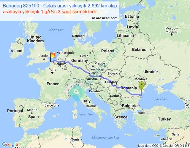 Babadağ 825100 - Calais arası yaklaşık olarak 90 km/h ile yukarıda belirtilen sürede olup, iki yerin kuş uçuşu uzaklığı (mesafesi) 2086'dir. Eğer belirtilen yerler arasında uçak seferi var ise bu süre uçakla 3 saat 12 dakika'ya kadar düşebilir. Yolculuk otobüsle 1 gün 11 saat sürmektedir.