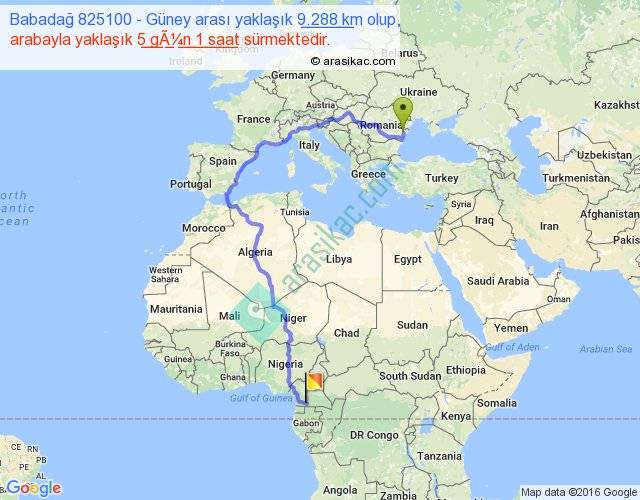 Babadağ 825100 - Güney arası yaklaşık olarak 90 km/h ile yukarıda belirtilen sürede olup, iki yerin kuş uçuşu uzaklığı (mesafesi) 4944'dir. Eğer belirtilen yerler arasında uçak seferi var ise bu süre uçakla 7 saat 36 dakika'ya kadar düşebilir. Yolculuk otobüsle 6 gün 13 saat sürmektedir.