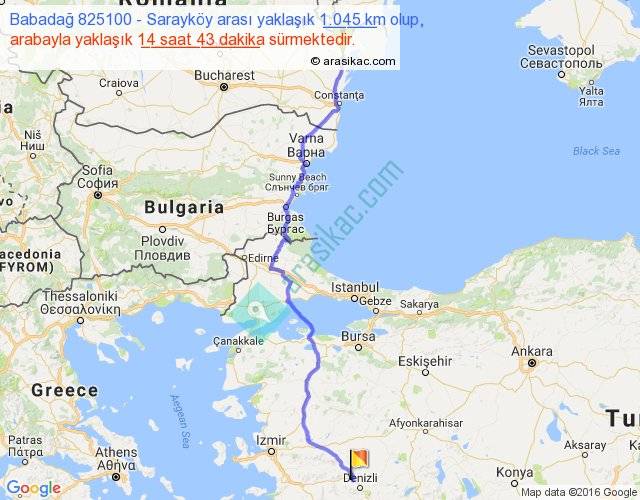 Babadağ 825100 - Sarayköy arası yaklaşık olarak 90 km/h ile yukarıda belirtilen sürede olup, iki yerin kuş uçuşu uzaklığı (mesafesi) 770'dir. Eğer belirtilen yerler arasında uçak seferi var ise bu süre uçakla 1 saat 11 dakika'ya kadar düşebilir. Yolculuk otobüsle 19 saat 7 dakika sürmektedir.