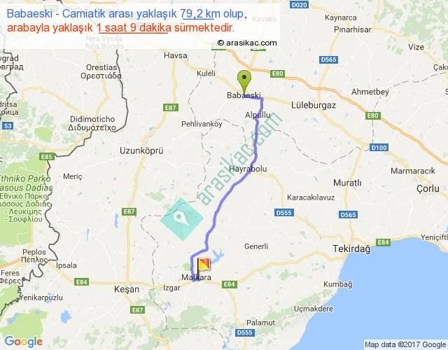 Babaeski - Camiatik arası yaklaşık olarak 90 km/h ile yukarıda belirtilen sürede olup, iki yerin kuş uçuşu uzaklığı (mesafesi) 62'dir. Yolculuk otobüsle 1 saat 29 dakika sürmektedir.