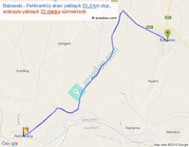 Babaeski - Pehlivanköy arası yaklaşık olarak 90 km/h ile yukarıda belirtilen sürede olup, iki yerin kuş uçuşu uzaklığı (mesafesi) 17'dir. Yolculuk otobüsle 28 dakika sürmektedir.