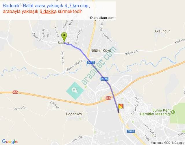 Bademli - Balat arası yaklaşık olarak 90 km/h ile yukarıda belirtilen sürede olup, iki yerin kuş uçuşu uzaklığı (mesafesi) 4'dir. Yolculuk otobüsle 7 dakika sürmektedir.