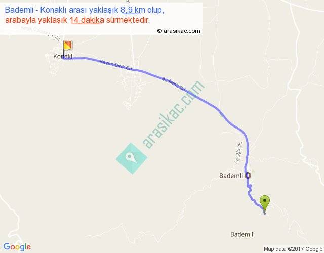 Bademli - Konaklı arası yaklaşık olarak 90 km/h ile yukarıda belirtilen sürede olup, iki yerin kuş uçuşu uzaklığı (mesafesi) 8'dir. Yolculuk otobüsle 18 dakika sürmektedir.