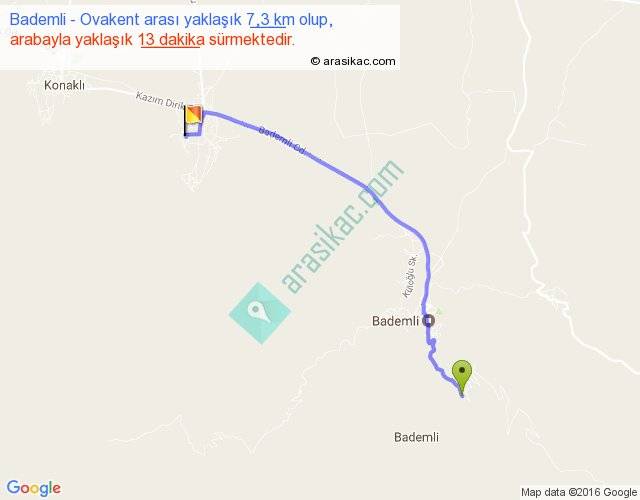 Bademli - Ovakent arası yaklaşık olarak 90 km/h ile yukarıda belirtilen sürede olup, iki yerin kuş uçuşu uzaklığı (mesafesi) 6'dir. Yolculuk otobüsle 16 dakika sürmektedir.