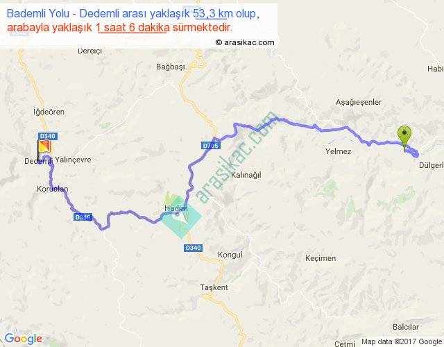 Bademli Yolu - Dedemli arası yaklaşık olarak 90 km/h ile yukarıda belirtilen sürede olup, iki yerin kuş uçuşu uzaklığı (mesafesi) 32'dir. Yolculuk otobüsle 1 saat 25 dakika sürmektedir.