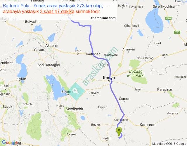 Bademli Yolu - Yunak arası yaklaşık olarak 90 km/h ile yukarıda belirtilen sürede olup, iki yerin kuş uçuşu uzaklığı (mesafesi) 214'dir. Yolculuk otobüsle 4 saat 55 dakika sürmektedir.