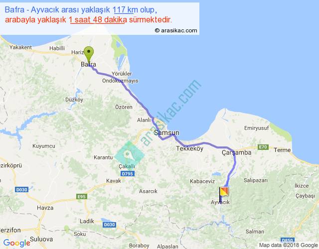 Bafra - Ayvacık arası yaklaşık olarak 90 km/h ile yukarıda belirtilen sürede olup, iki yerin kuş uçuşu uzaklığı (mesafesi) 826'dir. Eğer belirtilen yerler arasında uçak seferi var ise bu süre uçakla 1 saat 16 dakika'ya kadar düşebilir. Yolculuk otobüsle 15 saat 34 dakika sürmektedir.