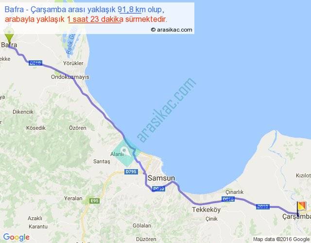 Bafra - Çarşamba arası yaklaşık olarak 90 km/h ile yukarıda belirtilen sürede olup, iki yerin kuş uçuşu uzaklığı (mesafesi) 79'dir. Yolculuk otobüsle 1 saat 47 dakika sürmektedir.