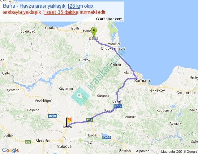 Bafra - Havza arası yaklaşık olarak 90 km/h ile yukarıda belirtilen sürede olup, iki yerin kuş uçuşu uzaklığı (mesafesi) 69'dir. Yolculuk otobüsle 2 saat 3 dakika sürmektedir.