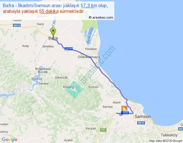 Bafra - İlkadım Samsun arası yaklaşık olarak 90 km/h ile yukarıda belirtilen sürede olup, iki yerin kuş uçuşu uzaklığı (mesafesi) 41'dir. Yolculuk otobüsle 1 saat 11 dakika sürmektedir.