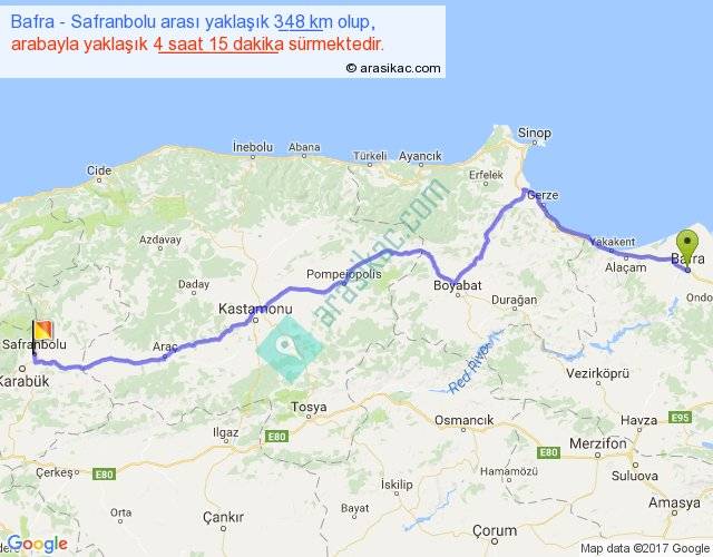 Bafra - Safranbolu arası yaklaşık olarak 90 km/h ile yukarıda belirtilen sürede olup, iki yerin kuş uçuşu uzaklığı (mesafesi) 269'dir. Eğer belirtilen yerler arasında uçak seferi var ise bu süre uçakla 24 dakika'ya kadar düşebilir. Yolculuk otobüsle 5 saat 31 dakika sürmektedir.
