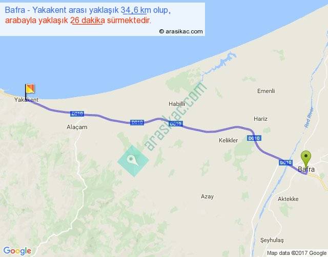 Bafra - Yakakent arası yaklaşık olarak 90 km/h ile yukarıda belirtilen sürede olup, iki yerin kuş uçuşu uzaklığı (mesafesi) 32'dir. Yolculuk otobüsle 35 dakika sürmektedir.