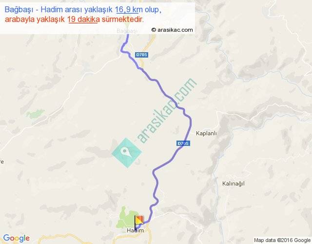 Bağbaşı - Hadim arası yaklaşık olarak 90 km/h ile yukarıda belirtilen sürede olup, iki yerin kuş uçuşu uzaklığı (mesafesi) 12'dir. Yolculuk otobüsle 24 dakika sürmektedir.