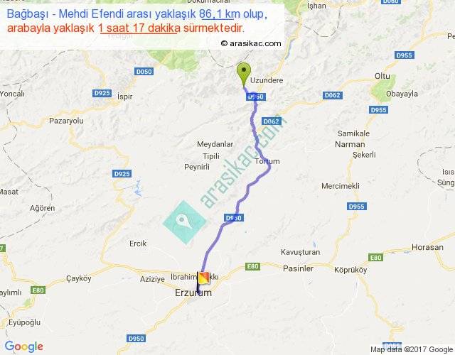 Bağbaşı - Mehdi Efendi arası yaklaşık olarak 90 km/h ile yukarıda belirtilen sürede olup, iki yerin kuş uçuşu uzaklığı (mesafesi) 69'dir. Yolculuk otobüsle 1 saat 40 dakika sürmektedir.