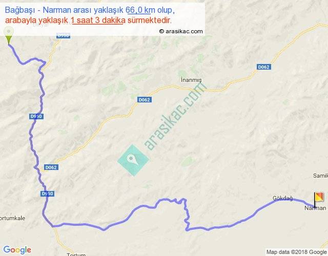 Bağbaşı - Narman arası yaklaşık olarak 90 km/h ile yukarıda belirtilen sürede olup, iki yerin kuş uçuşu uzaklığı (mesafesi) 39'dir. Yolculuk otobüsle 1 saat 21 dakika sürmektedir.