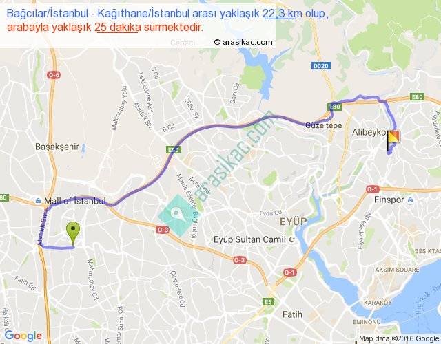 Bağcılar İstanbul - Kağıthane İstanbul arası yaklaşık olarak 90 km/h ile yukarıda belirtilen sürede olup, iki yerin kuş uçuşu uzaklığı (mesafesi) 14'dir. Yolculuk otobüsle 32 dakika sürmektedir.