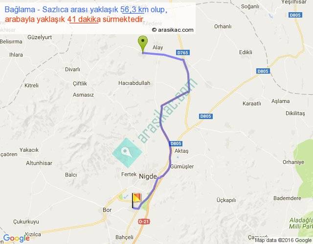 Bağlama - Sazlıca arası yaklaşık olarak 90 km/h ile yukarıda belirtilen sürede olup, iki yerin kuş uçuşu uzaklığı (mesafesi) 38'dir. Yolculuk otobüsle 53 dakika sürmektedir.