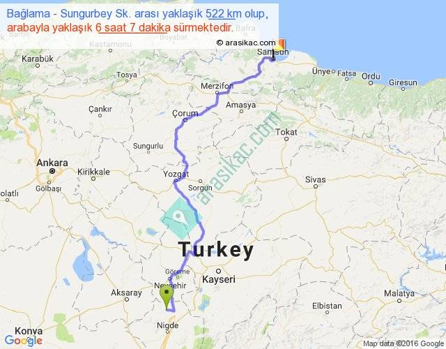 Bağlama - Sungurbey Sk. arası yaklaşık olarak 90 km/h ile yukarıda belirtilen sürede olup, iki yerin kuş uçuşu uzaklığı (mesafesi) 364'dir. Eğer belirtilen yerler arasında uçak seferi var ise bu süre uçakla 33 dakika'ya kadar düşebilir. Yolculuk otobüsle 7 saat 57 dakika sürmektedir.