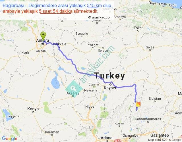 Bağlarbaşı - Değirmendere arası yaklaşık olarak 90 km/h ile yukarıda belirtilen sürede olup, iki yerin kuş uçuşu uzaklığı (mesafesi) 384'dir. Eğer belirtilen yerler arasında uçak seferi var ise bu süre uçakla 35 dakika'ya kadar düşebilir. Yolculuk otobüsle 7 saat 40 dakika sürmektedir.