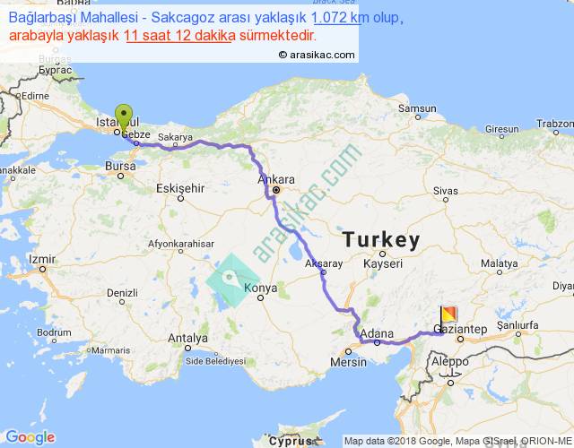Bağlarbaşı Mahallesi - Sakcagoz arası yaklaşık olarak 90 km/h ile yukarıda belirtilen sürede olup, iki yerin kuş uçuşu uzaklığı (mesafesi) 787'dir. Eğer belirtilen yerler arasında uçak seferi var ise bu süre uçakla 1 saat 12 dakika'ya kadar düşebilir. Yolculuk otobüsle 14 saat 33 dakika sürmektedir.
