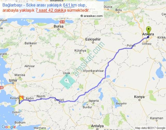 Bağlarbaşı - Söke arası yaklaşık olarak 90 km/h ile yukarıda belirtilen sürede olup, iki yerin kuş uçuşu uzaklığı (mesafesi) 532'dir. Eğer belirtilen yerler arasında uçak seferi var ise bu süre uçakla 49 dakika'ya kadar düşebilir. Yolculuk otobüsle 10 saat 0 dakika sürmektedir.