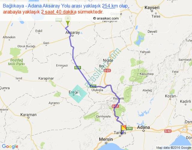 Bağlıkaya - Adana Aksaray Yolu arası yaklaşık olarak 90 km/h ile yukarıda belirtilen sürede olup, iki yerin kuş uçuşu uzaklığı (mesafesi) 193'dir. Yolculuk otobüsle 3 saat 28 dakika sürmektedir.