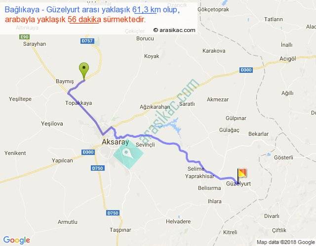 Bağlıkaya - Güzelyurt arası yaklaşık olarak 90 km/h ile yukarıda belirtilen sürede olup, iki yerin kuş uçuşu uzaklığı (mesafesi) 45'dir. Yolculuk otobüsle 1 saat 12 dakika sürmektedir.
