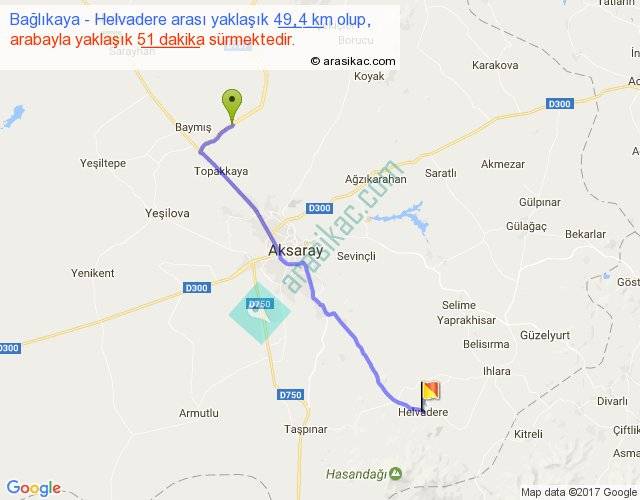 Bağlıkaya - Helvadere arası yaklaşık olarak 90 km/h ile yukarıda belirtilen sürede olup, iki yerin kuş uçuşu uzaklığı (mesafesi) 41'dir. Yolculuk otobüsle 1 saat 6 dakika sürmektedir.
