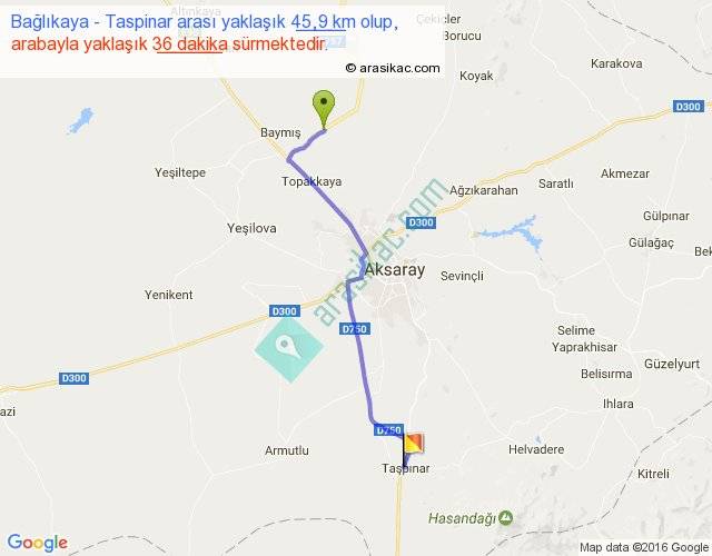 Bağlıkaya - Taspinar arası yaklaşık olarak 90 km/h ile yukarıda belirtilen sürede olup, iki yerin kuş uçuşu uzaklığı (mesafesi) 37'dir. Yolculuk otobüsle 46 dakika sürmektedir.