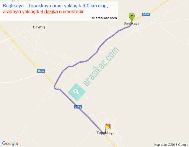 Bağlıkaya - Topakkaya arası yaklaşık olarak 90 km/h ile yukarıda belirtilen sürede olup, iki yerin kuş uçuşu uzaklığı (mesafesi) 6'dir. Yolculuk otobüsle 10 dakika sürmektedir.