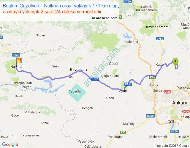 Bağlum Güzelyurt - Nallıhan arası yaklaşık olarak 90 km/h ile yukarıda belirtilen sürede olup, iki yerin kuş uçuşu uzaklığı (mesafesi) 124'dir. Yolculuk otobüsle 3 saat 7 dakika sürmektedir.