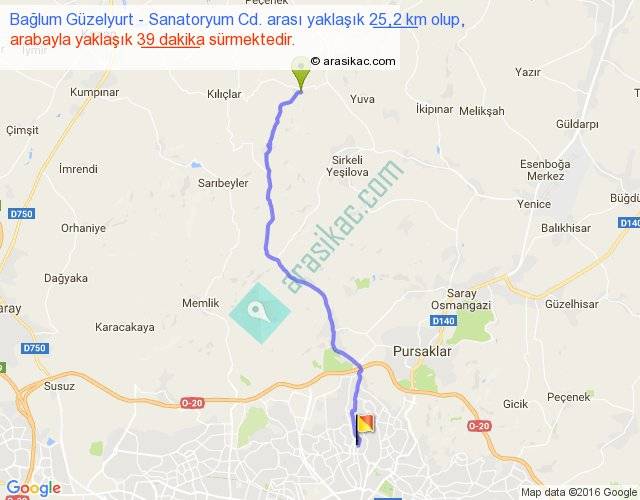 Bağlum Güzelyurt - Sanatoryum Cd. arası yaklaşık olarak 90 km/h ile yukarıda belirtilen sürede olup, iki yerin kuş uçuşu uzaklığı (mesafesi) 21'dir. Yolculuk otobüsle 50 dakika sürmektedir.