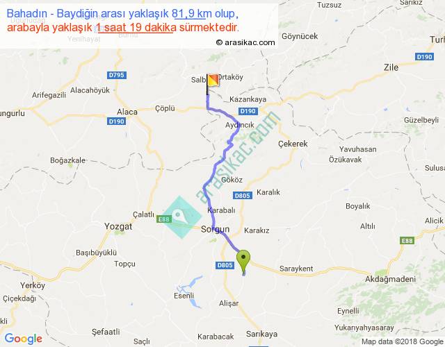 Bahadın - Baydiğin arası yaklaşık olarak 90 km/h ile yukarıda belirtilen sürede olup, iki yerin kuş uçuşu uzaklığı (mesafesi) 61'dir. Yolculuk otobüsle 1 saat 42 dakika sürmektedir.