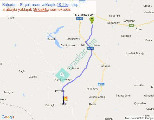 Bahadın - Sırçalı arası yaklaşık olarak 90 km/h ile yukarıda belirtilen sürede olup, iki yerin kuş uçuşu uzaklığı (mesafesi) 41'dir. Yolculuk otobüsle 1 saat 15 dakika sürmektedir.