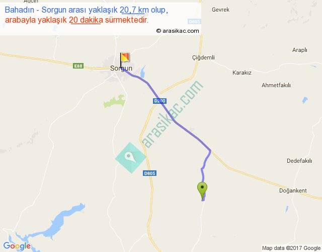 Bahadın - Sorgun arası yaklaşık olarak 90 km/h ile yukarıda belirtilen sürede olup, iki yerin kuş uçuşu uzaklığı (mesafesi) 18'dir. Yolculuk otobüsle 26 dakika sürmektedir.