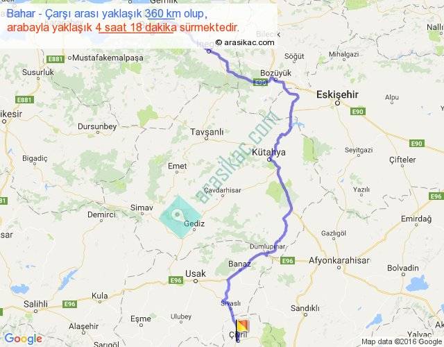 Bahar - Çarşı arası yaklaşık olarak 90 km/h ile yukarıda belirtilen sürede olup, iki yerin kuş uçuşu uzaklığı (mesafesi) 217'dir. Yolculuk otobüsle 5 saat 35 dakika sürmektedir.