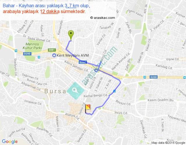 Bahar - Kayhan arası yaklaşık olarak 90 km/h ile yukarıda belirtilen sürede olup, iki yerin kuş uçuşu uzaklığı (mesafesi) 2'dir. Yolculuk otobüsle 15 dakika sürmektedir.