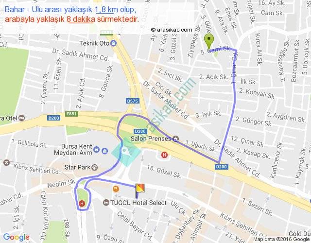 Bahar - Ulu arası yaklaşık olarak 90 km/h ile yukarıda belirtilen sürede olup, iki yerin kuş uçuşu uzaklığı (mesafesi) 1'dir. Yolculuk otobüsle 10 dakika sürmektedir.