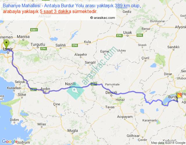 Bahariye Mahallesi - Antalya Burdur Yolu arası yaklaşık olarak 90 km/h ile yukarıda belirtilen sürede olup, iki yerin kuş uçuşu uzaklığı (mesafesi) 293'dir. Eğer belirtilen yerler arasında uçak seferi var ise bu süre uçakla 27 dakika'ya kadar düşebilir. Yolculuk otobüsle 6 saat 33 dakika sürmektedir.