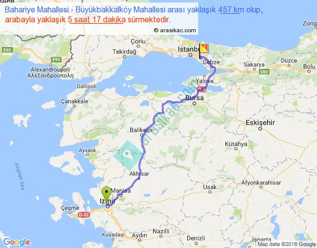 Bahariye Mahallesi - Büyükbakkalköy Mahallesi arası yaklaşık olarak 90 km/h ile yukarıda belirtilen sürede olup, iki yerin kuş uçuşu uzaklığı (mesafesi) 327'dir. Eğer belirtilen yerler arasında uçak seferi var ise bu süre uçakla 30 dakika'ya kadar düşebilir. Yolculuk otobüsle 6 saat 52 dakika sürmektedir.