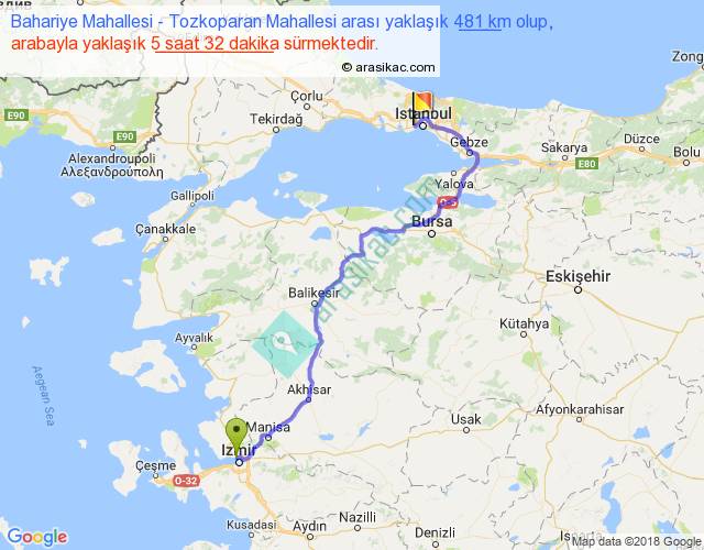 Bahariye Mahallesi - Tozkoparan Mahallesi arası yaklaşık olarak 90 km/h ile yukarıda belirtilen sürede olup, iki yerin kuş uçuşu uzaklığı (mesafesi) 320'dir. Eğer belirtilen yerler arasında uçak seferi var ise bu süre uçakla 29 dakika'ya kadar düşebilir. Yolculuk otobüsle 7 saat 11 dakika sürmektedir.