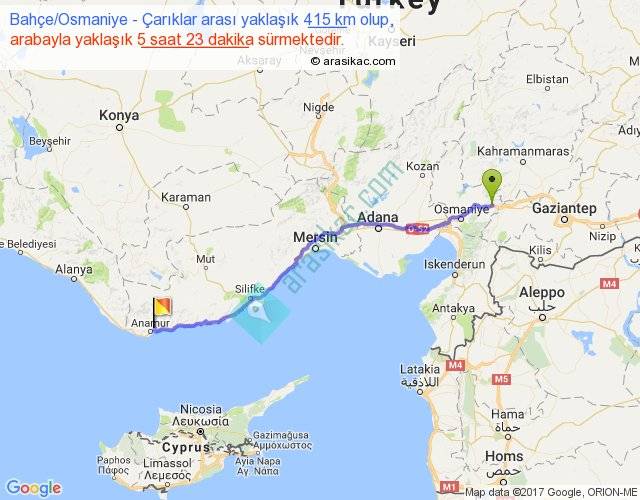 Bahçe Osmaniye - Çarıklar arası yaklaşık olarak 90 km/h ile yukarıda belirtilen sürede olup, iki yerin kuş uçuşu uzaklığı (mesafesi) 350'dir. Eğer belirtilen yerler arasında uçak seferi var ise bu süre uçakla 32 dakika'ya kadar düşebilir. Yolculuk otobüsle 6 saat 59 dakika sürmektedir.