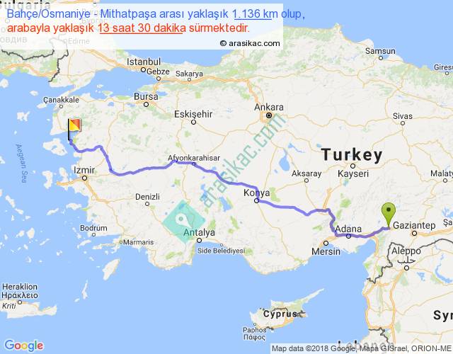 Bahçe Osmaniye - Mithatpaşa arası yaklaşık olarak 90 km/h ile yukarıda belirtilen sürede olup, iki yerin kuş uçuşu uzaklığı (mesafesi) 891'dir. Eğer belirtilen yerler arasında uçak seferi var ise bu süre uçakla 1 saat 22 dakika'ya kadar düşebilir. Yolculuk otobüsle 17 saat 33 dakika sürmektedir.