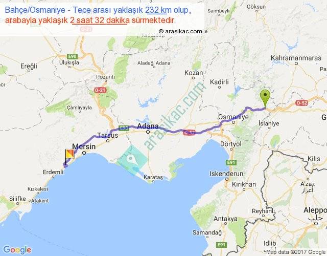 Bahçe Osmaniye - Tece arası yaklaşık olarak 90 km/h ile yukarıda belirtilen sürede olup, iki yerin kuş uçuşu uzaklığı (mesafesi) 197'dir. Yolculuk otobüsle 3 saat 17 dakika sürmektedir.