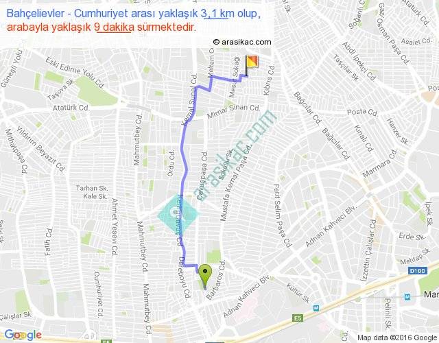 Eğer Bahçelievler Cumhuriyet arası ne kadar yakar (benzin/mazot) diyorsanız, kilometrede 3 ₺ yakan bir aracınız var ise 9, km'de 4 ₺ yakan bir aracınız var ise 12, km'de 5 ₺ yakan bir aracınız var ise 15 ile bu yolculuğu tamamlayabilirsiniz.