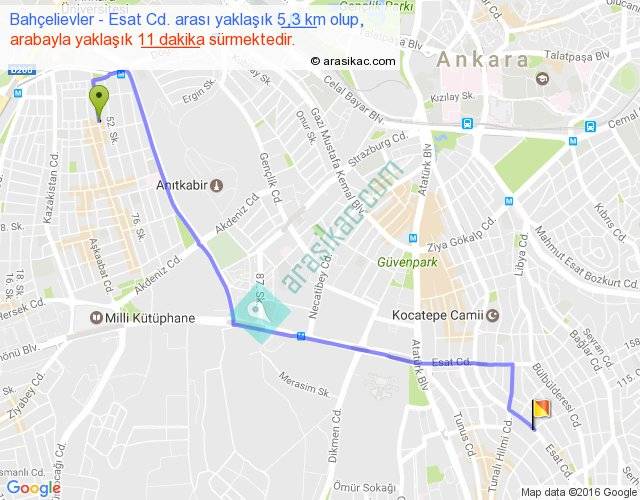 Bahçelievler - Esat Cd. arası yaklaşık olarak 90 km/h ile yukarıda belirtilen sürede olup, iki yerin kuş uçuşu uzaklığı (mesafesi) 4'dir. Yolculuk otobüsle 14 dakika sürmektedir.