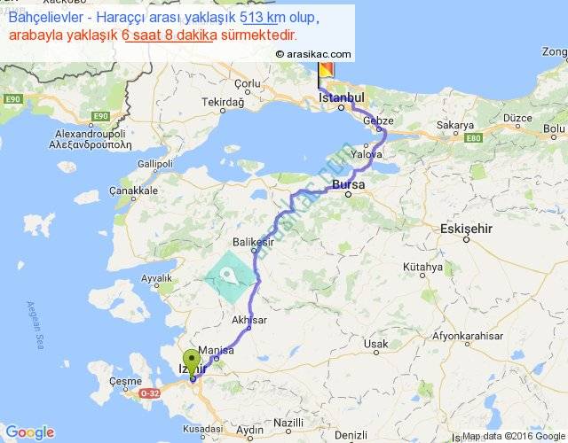 Bahçelievler - Haraççı arası yaklaşık olarak 90 km/h ile yukarıda belirtilen sürede olup, iki yerin kuş uçuşu uzaklığı (mesafesi) 336'dir. Eğer belirtilen yerler arasında uçak seferi var ise bu süre uçakla 31 dakika'ya kadar düşebilir. Yolculuk otobüsle 7 saat 58 dakika sürmektedir.